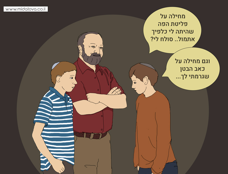 בפרשתנו מאריכה התורה לעסוק בריפוי רוחני שנחוץ למי שמספר לשון הרע. גם בסיפורנו גילה האבא עודד שהתרופה לכאב הבטן, הפעם, אינה צריכה להתיחס לגוף אלא לנפש, למצב הרוח של ירון, הבן, ואכן מצא אותה בכך שחברו ביקש ממנו סליחה על שפגע בו.